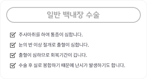 ※ 모든 백내장 환자에게 시술할 수 있는 것은 아닙니다. 다른 안질환이 있는 경우 심한 난시가 있는 경우, 근시가 심한 경우, 직업상 야간에 일하는 경우 충분한 상담과 사전 검사를 통해 수술 가능 여부를 확인 해야 합니다.