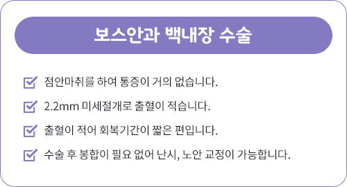 백내장 수술에 알맞는 수술시간은 약 15~20분입니다. 보스안과는 이 수술시간을 엄수하고 있습니다. 수술에 있어 완벽을 추구하며, 부작용 0%를 지향합니다.
