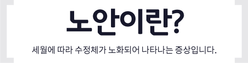하지만 노화로 인해 이러한 역할을 하는 수정체가 노화로 인해 딱딱해지고, 탄력성이 떨어지게 되면서 초점을 조절하는 능력이 떨어져 가까운 거리가 잘 안 보이게 되는 것을 노안이라고 합니다.